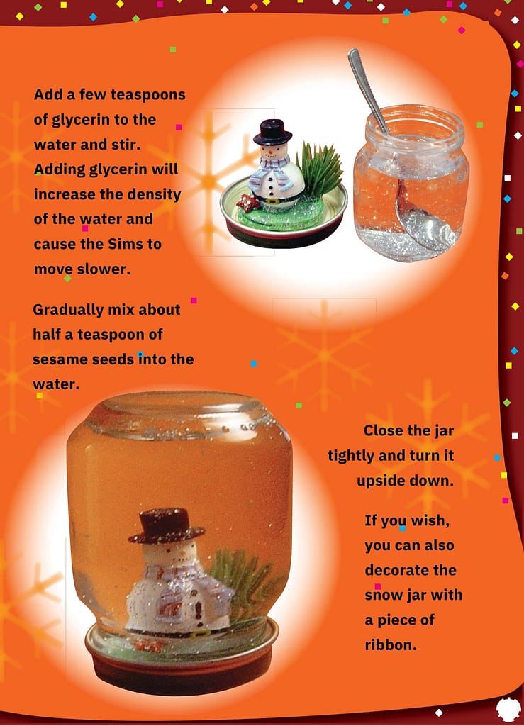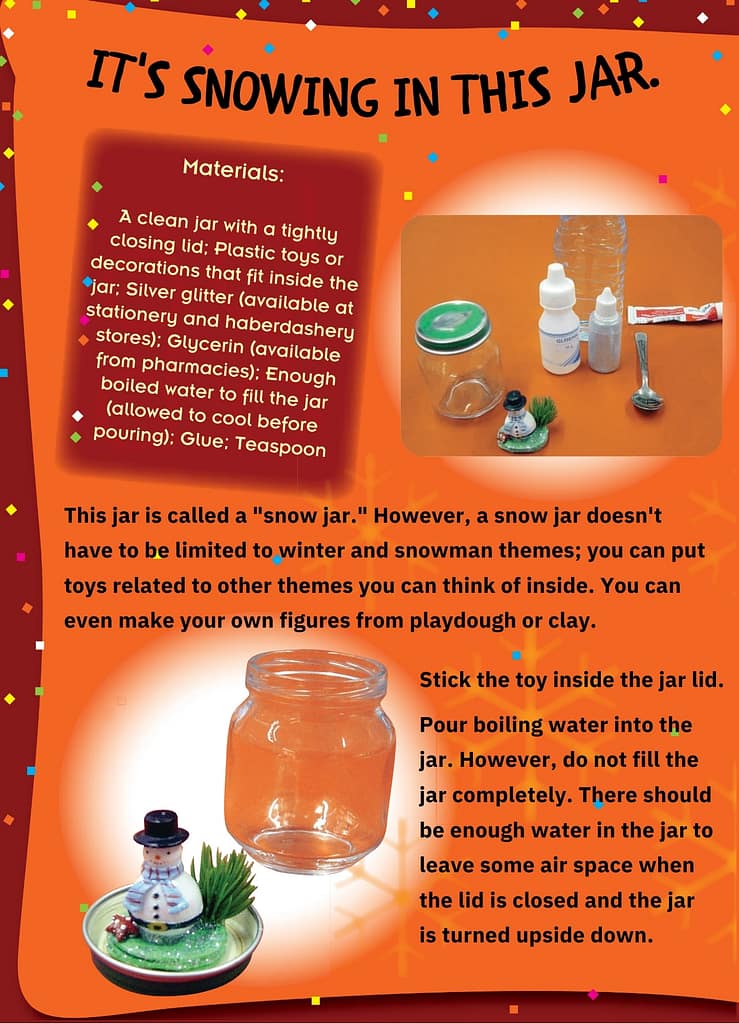 This jar is called a “snow jar.” However, a snow jar doesn’t have to be limited to winter and snowman themes; you can put toys related to other themes you can think of inside. You can even make your own figures from playdough or clay.