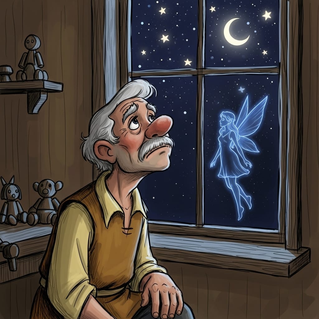 A long, long time ago, in a little village, there lived a kind old toy maker named Geppetto. He carved wonderful wooden toys that all the children loved. But even though he made toys for others, Geppetto was lonely. His biggest wish was to have a little boy of his own.