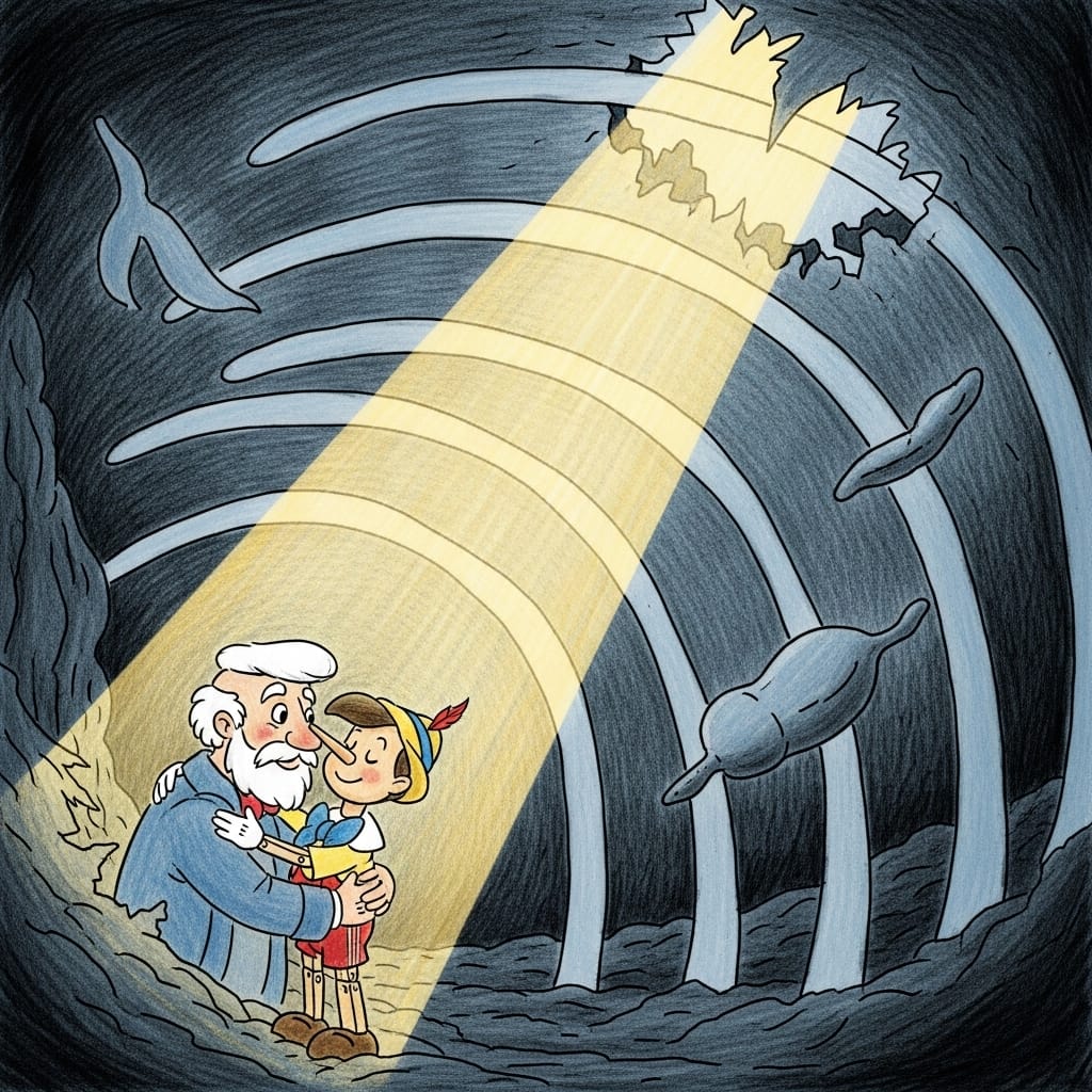 It was dark and wet inside the whale’s belly. Pinocchio cried, “Oh, Papa! I’m so sorry I didn’t listen! I wish you were here!”